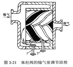 圖3-21表示了塞柱閥調(diào)節(jié)輸氣量的工作原理。塞柱閥的啟閉是通過電磁閥控制液壓泵中油的進(jìn)出來實現(xiàn)的。塞柱閥調(diào)節(jié)輸氣量只能實現(xiàn)有級調(diào)節(jié)。這種調(diào)節(jié)方法在小型、緊湊型螺桿壓縮機中常??梢钥吹?。