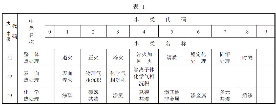 熱處理工藝方法小類名稱及代碼按表1 的規(guī)定。